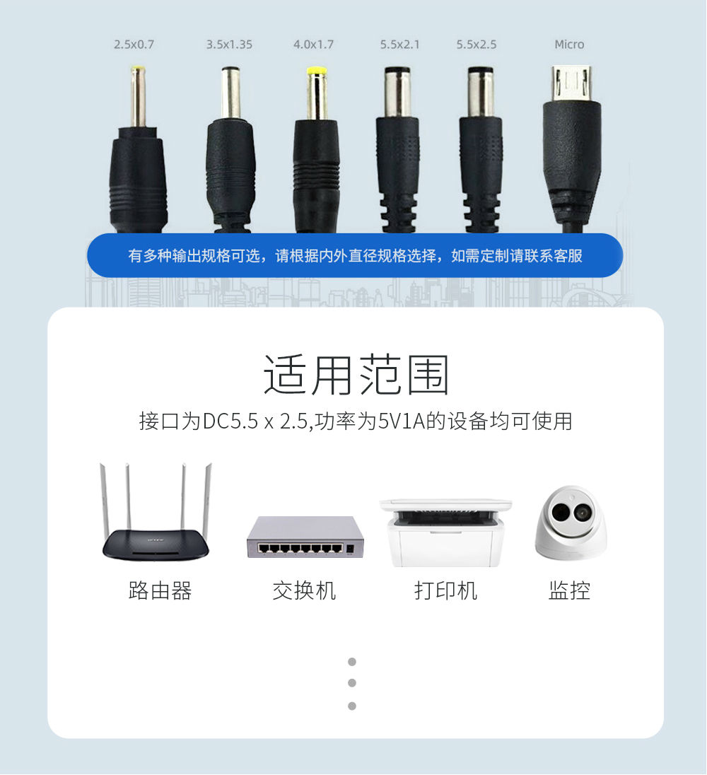 适用于小台灯、电动牙刷、香水机 、洗头器、刮胡刀、洗脸仪、美容仪、眼罩、香熏机、加湿器、灭蚊灯、美甲器、洁面机、VR(3D眼镜)、植物生长灯等IT设备。