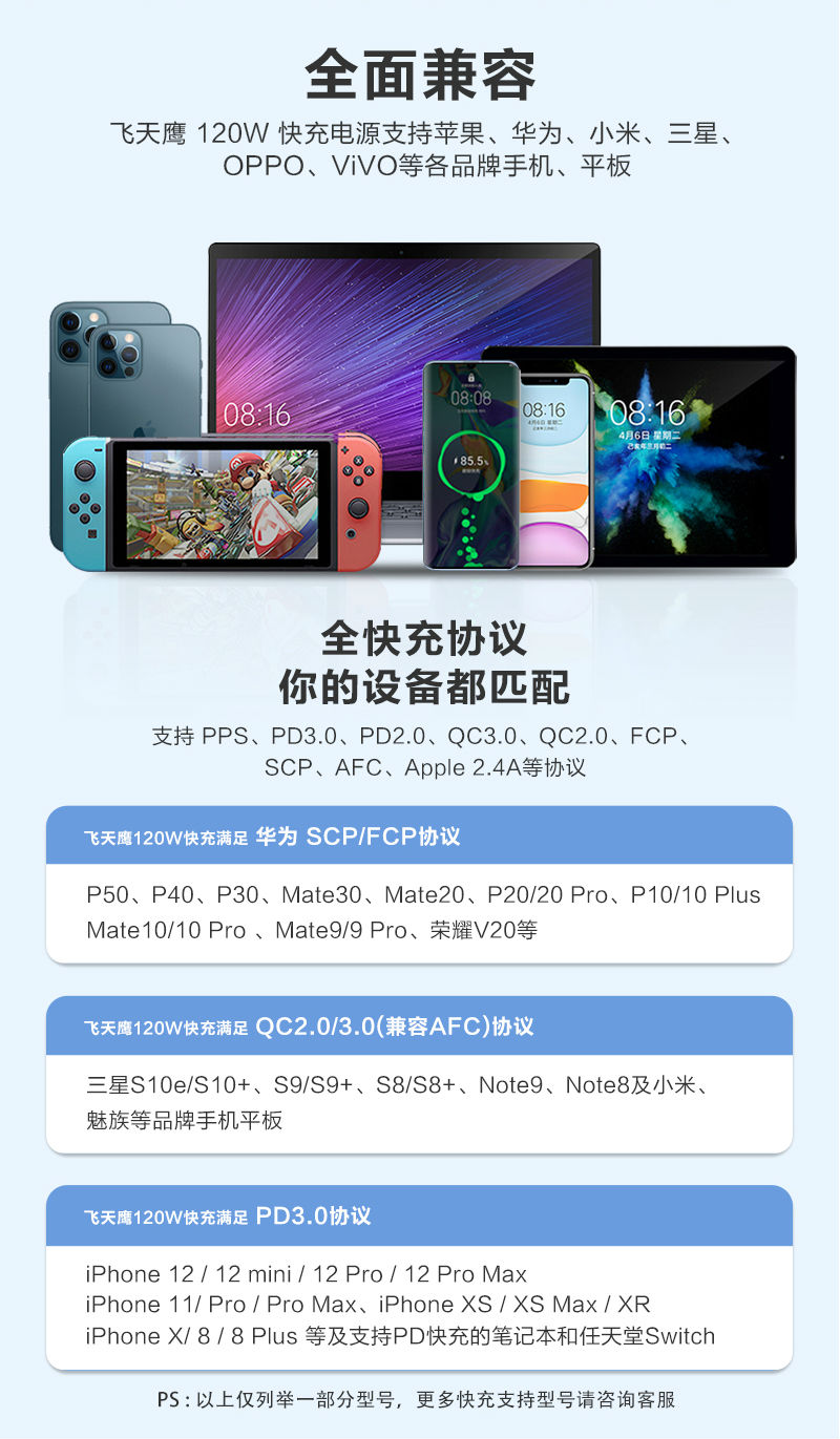 飞天鹰120W氮化镓充电器支持苹果、华为、小米、三星、OPPO、VIVO等各品牌手机和平板