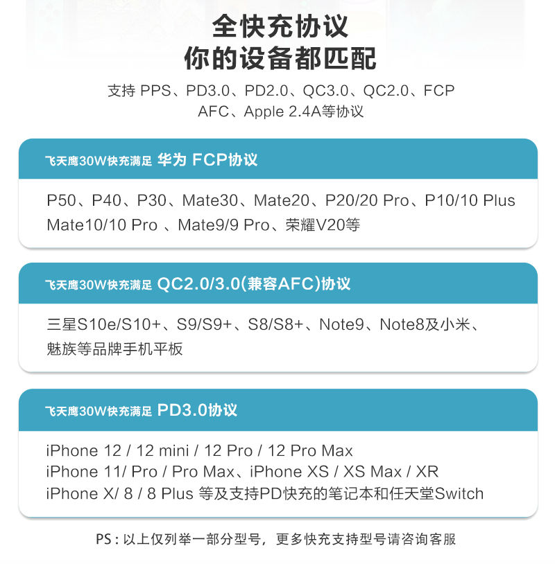 支持协议:PD3.0 FCP AFC SCP BC1.21 Apple 2.4A等协议