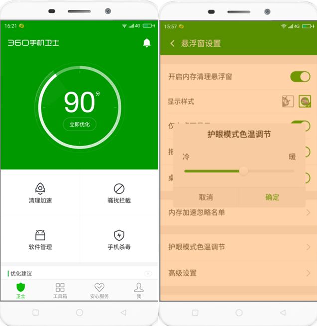 现在的许多智能手机都推出了护眼模式,通过屏蔽蓝光,调节屏幕亮度增加黄 色调,用软甲算法减少蓝光,从而使得RGB色调中的红光、绿光得意更多的融合,形成我们常见的屏幕黄光。这样就可以屏蔽掉一部分蓝光。