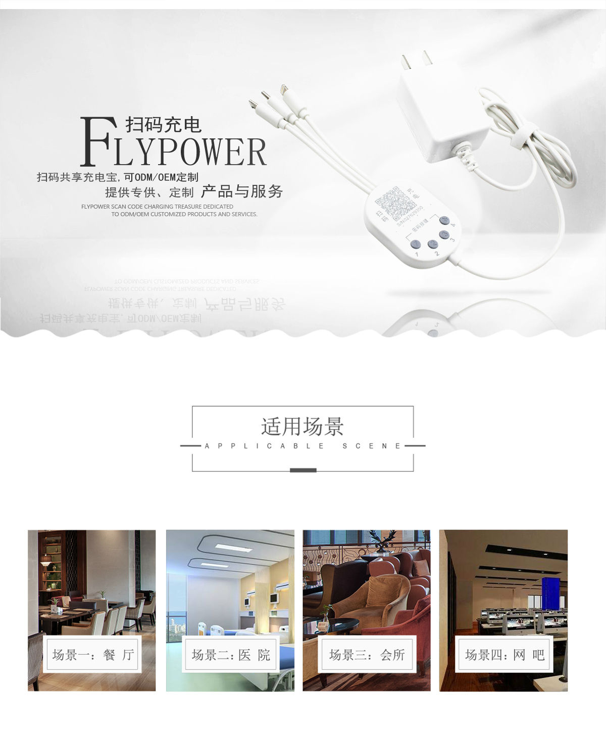 飞天鹰扫码充电器适用于餐厅、医院、网吧、会所等固定场景,可以为使用安卓。苹果、Type-c接口的手机和平板电脑等设备快速充电。