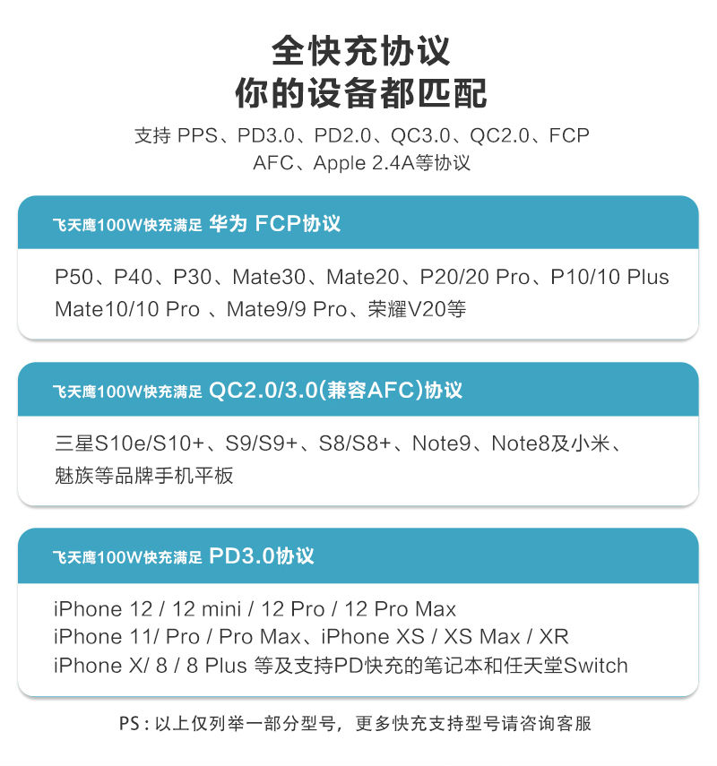 飞天鹰100W氮化镓充电器支持苹果、华为、小米、三星、OPPO、VIVO等各品牌手机和平板