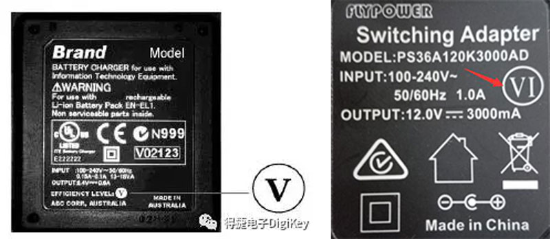 在电源适配器产品铭牌上,一般会有一个参数叫能效等级(Efficiency Level),通常用罗马数字表示,它与电源适配器的效率有关,能效等级越高,就代表着电源的效率越高。