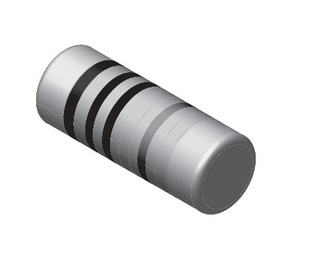 圆柱形电阻可分为碳膜和金属膜两大类,价格较便宜,电阻额定功率有1/10W、1/8W和1/4W三种,对应规格分别为1.2 × 2.0mm、 1.5 × 3.5mm、 2.2 × 5.9mm,体积大的功率也大,其标志采用常见的色环标志法,参数与矩形贴片电阻相近。